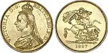For the various reverses, according to Dyer and Gaspar, "Fremantle had revived some of the finest heraldic designs from the past".[16] He felt that a reverse design with the denomination inside a wreath was "feeble", and sought artistic designs.[16] Fremantle selected designs originating with the Great Recoinage of 1816–1817 or even further back, and these were engraved by Wyon.[17] In 1873, soon after he had assumed the deputy mastership, Fremantle had secured the return of Benedetto Pistrucci's 1817 design of Saint George and the Dragon to the sovereign,[16] for the first time in almost half a century.[18] This design appeared on the gold sovereign, double sovereign and five-pound piece of the Jubilee coinage, and also on the silver crown, or five-shilling piece.[19] Beginning with the Jubilee coinage, a plume was restored to Pistrucci's design; it had featured in his original work, but had later been omitted.[20] The sixpence, shilling, florin, half crown, half sovereign and a new coin, the double florin, were given variations of the ensigns armorial of the United Kingdom. This was done in several guises: thus, according to the proclamation making them current that was issued in May 1887, the half sovereign had a "garnished Shield surmounted by the Royal Crown" while on the half crown, they were "in a plain Shield surrounded by the Garter, bearing the Motto 'Honi soit qui mal y pense' and the Collar of the Garter".[19] The half sovereign's reverse design was a slight modification to those of earlier Victorian half sovereigns, and its crowned shield did not differ much from designs used since the denomination had originated in 1817.[21] Each of the reverses for the sixpence and above carried the date of minting, but none carried a statement of the coin's monetary value.[22] The sixpence had borne a wreath surrounding a statement of its value since 1831,[23] with one reason for this being that it was the same size as the half sovereign, and was sometimes fraudulently plated to pass as one.[7]