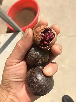 J. regia Zijing was cultivated by Wang Xiupo.[1][3] On 17 October 2017, Wang obtained the certificate of plant variety rights from the State Forestry Administration of China.[4] Because J. regia Zijing trees have five major purple features: female flowers, leaves, peel, and kernels, they are also called Wuzi Walnut (五紫核桃).[5] The trees are mainly distributed in Beijing International Walnut Manor.[1]