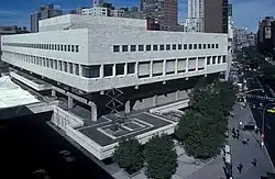 In 1957, after two years of deliberation, the Juilliard School of Music board announced that the school would relocate from upper Manhattan to the future Lincoln Center.[38] The Lincoln Center would cover the costs for the construction project, but the school would have to instruct exclusively advanced students, introduce a drama program and cut its Preparatory School.[39] Juilliard's new building at Lincoln Center would be designed by Pietro Belluschi with associates Eduardo Catalano and Helge Westermann.[38] The Juilliard School building at Lincoln Center was completed on October 26, 1969, officially opening with a dedication ceremony and concert.[40][41] With Lincoln Center's prestige came a newly elevated status for the Juilliard School.[42][43]