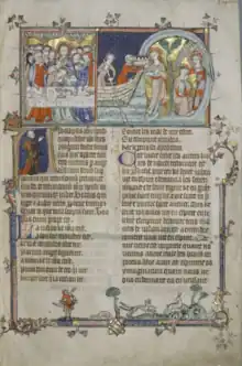 She gave the manor of Dene in Thanet to the abbey and she created a chantry to say daily prayers for her after her death.[2] On about 1 November she died and she was buried at the abbey in her St Anne's Chapel. She had ignored her grandson heir, John Hastings, 2nd Earl of Pembroke, and she had arranged for her possessions to be transferred to Edward III.[1] Her possessions at death are known because there is an inventory that is extant.[4] She left a highly illustrated book called an Apocalypse to St Augustine's Abbey. She had been left the book by Henry de Cobham, 1st Baron Cobham, when he died in 1339.[5] Notable items in the inventory were the textiles and today there are still examples of embroidery which include the Huntingdon crest. A larger item was a hanging featuring the English hero Bevis of Hampton. It is possible that she did some of the textile work.[1]