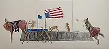 Buffalohead's art focuses on Indigenous experiences and stories, often subverting imagery of Native people used in popular culture, including Disney's Pocahontas.[7][8] She often uses metaphors and allegorical images in her work to critique issues within modern society such as gun violence.[1] While her work often includes imagery such as tea parties, and children's cartoon characters, Buffalohead has said that the work is intended to be unsettling.[4] Buffalohead's work also incorporates the use of anthropomorphic animals, mainly coyotes.[4][9] Buffalohead is a mixed media artist, and works in many different mediums, including oil paints, birch bark, porcupine quills, and printmaking.[6]