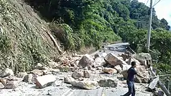 The 2013 Nantou earthquake struck central Taiwan with a moment magnitude of 6.2 on 2 June at 1:43 p.m. local time.[4] The epicenter was located in mountainous terrain in Ren'ai Township, Nantou County, Taiwan, not far from Sun Moon Lake, close to the epicentre of another large earthquake a little over two months earlier.[4] News reports indicate that five people were killed; three in Nantou County and two in neighbouring Chiayi County.[1][3] The earthquake could be felt in Hong Kong, Zhejiang, Fujian, and Guangdong, China.