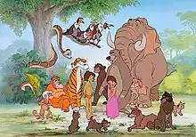 Peet created his treatment with little supervision, as he had done with One Hundred and One Dalmatians and The Sword in the Stone.[39] He tried to make the story more linear, since the novel was very episodic, while preserving its ominous tone[34] and adding more drama and suspense; in particular, Peet's story would start with wolves and Bagheera rescuing baby Mowgli from falling from a waterfall.[40] He also decided on Mowgli's journey from the jungle back to the Man-Village as the film's central storyline.[40] One of the few major departures from Kipling's works was the character of Baloo, whom Peet rewrote into a "big playful buffoon of a bear",[41] with the role of Mowgli's serious-minded mentor given to Bagheera.[8] Peet also created an original character for the film - Louie, the leader of the Bandar-log,[10] who would kidnap Mowgli and try to get him to teach them how to make fire and rebuild the ancient city; Louie would also show Mowgli the treasure under the ruins (a plot point borrowed from The Second Jungle Book), which would serve as a setup for the film's climax.[40] After Mowgli had arrived to the Man-Village, he would get into an argument with the local hunter Buldeo, which would cause Mowgli to return to the jungle with a torch and use it to scare those who attacked or mocked him through the journey and confront Shere Khan, before being dragged to the ancient city by Buldeo in search for the treasure.[42] After taking some of the treasures, Buldeo would attempt to burn the jungle to avoid the threat of Shere Khan, only for the tiger to attack and kill him, before being killed by Mowgli with Buldeo's rifle.[43] Because of his actions, Mowgli would be hailed as a hero in both the jungle and the village[40] and declared the first human member of the wolves' council.[42]