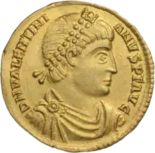 Valentinian I died in 375.[17] According to Ammianus Marcellinus, Zosimus and Philostorgius, Justina was living near Sirmium by the time she was widowed. During the reign of Valentinian II, she moved with him to Mediolanum (Milan). She assisted her young son Valentinian II's rule.