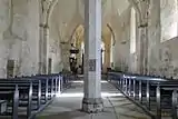 Of the interior, murals, the font and a wooden sculpture of St. Simon of Cyrene are all medieval. A large set of finely carved late Gothic wooden sculptures, at least some of which were possibly made by Lübeck master carver Henning von der Heide, were originally also displayed in the church but are today housed in Saaremaa Museum in Kuressaare Castle. Additionally, the pillars of the church are decorated with stone carvings from the 15th century, displaying a plain, primitive and evocative style that is clearly related to stone carving from the same time from Padise Abbey and the medieval Dominican cloister in Tallinn. The pulpit (1645) and the neo-Gothic altarpiece decorated by Otto Friedrich Theodor von Möller are later, also noteworthy interior details.[5]