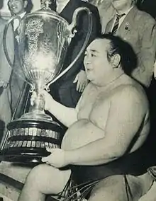 ![]() Kagamisato with the Emperor's Cup after his first tournament victory as a yokozuna in September 1955 | |