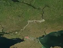 The reservoir covers a total area of 2,155 km2 (832 sq mi) in the Kherson, Zaporizhzhia, and Dnipropetrovsk Oblasts of Ukraine.[2] It is 240 km (150 mi) long and up to 23 km (14 mi) wide. The depth varies from 3 to 26 m (9.8 to 85.3 ft; 1.6 to 14.2 fathoms) and averages 8.4 m (28 ft; 4.6 fathoms). The total water volume is 18.2 km3 (4.4 cu mi). The Kakhovka dam has resulted in the natural water level of the Dnieper River being raised 16 m (52 ft).[3] Locals sometimes referred to the reservoir as the Kakhovka Sea as the other side of the river bank could not be seen at some points.[4]