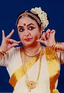 Of the two books Kalyanikutty Amma has authored, "Mohiniyattam - History and Dance Structure" is considered as an elaborate and only authentic documentation on Mohiniyattam.[4] Noted among her disciples are her daughters Sreedevi Rajan, Kala Vijayan, Mrinalini Sarabhai, Deepti Omchery Bhalla and Smitha Rajan.[5]