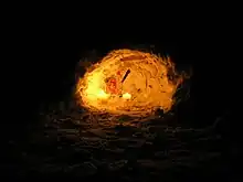 Not far north from Yokote City in the Semboku District of Akita prefecture another kamakura festival is held each February 11 to 15.[6] The "Rokugō Kamakura Festival" has been classified as an Intangible Folk Cultural Asset by the Japanese Agency for Cultural Affairs.[7] This festival is centered around Akita Suwagu Shrine, which is near Iizume Station on the Ōu Main Line. During that festival, numerous kamakura ice houses can be seen. However, photographs reveal that not all of these have a rounded shapes: some have square walls and thatched bamboo roofs. In fact, such structures are known as torioi koya (鳥追小屋, lit. "bird chasing huts"). Moreover, the Shinto deity "Kamakura Daimyojin" is enshrined in some of those ceremonial winter huts. On each February 13 in Rokugō village, children typically visit each other's huts and sing songs about chasing birds. Two days later, there is usually a rice-cake pounding ceremony to celebrate the end of winter. During that time, willow cocoon balls are made to decorate altars of the deity Kamakura Daimyojin. Those cocoon balls are fashioned from rice cakes attached to willow twigs. Other traditional ceremonies are held during this festival such as bamboo pole battles between opposing teams as well as "bonfire battles" featuring blazing long bamboo poles.[8]