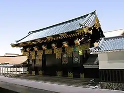 The mansion consisted of a main building with two large roofs, constructed of cryptomeria wood. The residence was only one storey high in the typical shōin style, with large roofs for ventilation. Apart from the main residence there were other minor buildings for servants as well as a number of gardens with trees. The complex was protected by high, white-washed walls with two-storey watch towers at each corner. The main access to the residence was through two large gates, while there were minor gates for servants in the back. One broad gate was close to the daidokoro, which was in the main part of the residence, while a second gate was reserved normally only for high visitors such as the shōgun himself. The gate for the shōgun was monumental in proportions, painted black with golden adornments, with two painted phoenixes above. The curved roof with the symbol of the Matsudaira clan above added to a sense of importance. A small moat ran along three sides of the mansion.
