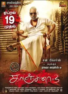 Kanchana 3 (marketed as Muni 4: Kanchana 3) is a 2019 Indian Tamil language action-comedy horror film[2] co-produced, written and directed by Raghava Lawrence. The film stars Raghava Lawrence in a dual role with Oviya, Vedhika, Nikki Tamboli and Ri Djavi Alexandra. While Kovai Sarala, Soori, Tarun Arora, and Kabir Duhan Singh play supporting roles. Produced by Sun Pictures, the fourth installment in the Muni (film series), the film began production during October 2018 and released on 19 April 2019. Later, the film was dubbed in Hindi as K3: Kaali Ka Karishma.[3]