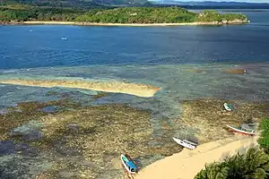 The Kangean Islands or simply Kangean (Indonesian: Kepulauan Kangean) is a collective name for a group of islands lying to the east of Madura. Kangean (the main island) and its surrounding islands lie to the north of Bali in the northern Bali Sea, to the northwest of the Lesser Sunda Islands (Nusa Tenggara),[3] and administratively they form three districts within Sumenep Regency, East Java Province. The group comprises a total of 91 islands including 27 inhabited islands. Kangean is located approximately 120 km (75 mi) in the north of Bali,[4] the northwest of Lombok, and 120 km east of Madura.[5] The biggest and most populous district is Arjasa, which includes the town of that name located in the west of the island. The Kangean Islands have a relatively large potential for natural resources, such as natural gas, teak, coconut, and salt production.[3]