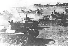 To ensure the success of the first phase of the invasion, enormous forces would be gathered. By 16 September, it was decided that "for operational preparations lasting three months and involving 23 or 24 divisions on the offensive (including the Korea Army)," the logistical basis would be 1,200,000 men, 35,000 motor vehicles, 500 tanks,[lower-alpha 4] 400,000 horses, and 300,000 laborers.[53] That would have meant, however, that the Western Front facing the Mongolian People's Republic and the Trans-Baikal region could be defended by only one division, the 23rd, as well as the equivalent in miscellaneous forces of a few more.[lower-alpha 5] Indeed, during the initial phase of operations, the Japanese Sixth Army was allocated only the 23rd Division and the 8th Border Guards Unit, veterans of the fighting at Khalkhin Gol two years earlier.[55] To minimize the danger from a Soviet counteroffensive in the west while the bulk of the Japanese Army was engaged in the east, the IJA hoped that delaying actions and the vast expanses of the Gobi Desert[56] and Hailar Plain[57] would serve as "strategic buffers" to prevent the Red Army from mounting a serious challenge to the heart of Manchuria before the main body had regrouped for a pivot westward. The final objective of the Japanese troops was a line running through Skovorodino and the western slopes of the Great Khingan Mountains, along which they would defeat the remaining Soviet forces and transition to a defensive stance.[58]