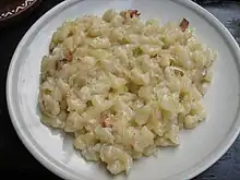 Strapačky (Slovak) or sztrapacska (Hungarian) is a dish popular in Slovakia and Hungary. It is similar to bryndzové halušky where the base compound of the dish is halušky (dumplings); however, in Slovakia, instead of bryndza, stewed sauerkraut is used.[1] In Hungary, sztrapacska is traditionally accompanied with juhtúró, the local equivalent to bryndza. It is thus akin to gnocchi with ewes' cheese. Residents of Vanyarc, located in Hungary approximately 80 kilometers from Budapest, have held a Festival of Strapačky (Vamyarci Haluskafesztivál) every September for almost 40 years. Ethnic Slovaks from all over Hungary compete for prizes at the festival.[2]