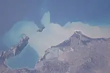 The Karaburun Peninsula is mostly hilly and a geological continuation of the Ceraunian Mountains, a mountain range rising immediately along the Ionian Sea. Its crests combine a northwest–southeast line with a series of distinct peaks along its irregular structure that are broken apart by steep and irregular slopes. The coastal landscape is marked by a rough relief and calcareous limestone cliffs, that dips vertically into the sea.[5] The uninhabited Sazan Island is primarily made up of limestone rocks, which was formed during the Cretaceous period. The waters of Mezokanal in the south separate the island from the peninsula. The most characteristic feature of the island is its unique climate. The island's climate is not mediterranean but rather subtropical on account of its warm winters and hot summers, resembling those of the south of Crete, of Tunisia and Egypt.