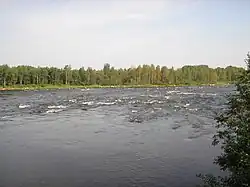 The Karelian Isthmus (Russian: Карельский перешеек, romanized: Karelsky peresheyek; Finnish: Karjalankannas; Swedish: Karelska näset) is the approximately 45–110-kilometre-wide (30–70 mi) stretch of land situated between the Gulf of Finland and Lake Ladoga in northwestern Russia, to the north of the River Neva.[1] Its northwestern boundary is a line from the Bay of Vyborg to the westernmost point of Lake Ladoga, Pekonlahti. If the Karelian Isthmus is defined as the entire territory of present-day Saint Petersburg and Leningrad Oblast to the north of the Neva and also a tiny part of the Republic of Karelia, the area of the isthmus is about 15,000 km2 (5,800 sq mi).