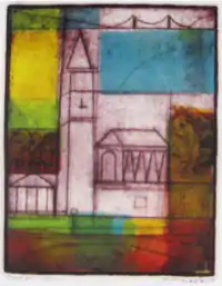 Kasten's paintings are predominantly acrylics on canvas, but he also works in watercolor and gouache. The graphics are primarily drawings in pencil, monoprints, drypoints and collagraphs. In the 1960s he began working in collography which is a variation of the etching process first practiced by Rudolph Nesch in the 1930s. Kasten's collographs are noteworthy for the sensitivity in texture and for the use of insertable parts such as coins and found objects to print a range of colors.
