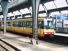 The Karlsruhe station is classified by Deutsche Bahn as a category 1 station.[1] It is served by Intercity-Express trains to Berlin, Hamburg, Dortmund and Basel, from Intercity trains to Stralsund, Cologne, Nuremberg, Munich and Konstanz and by TGV trains to Paris and Stuttgart. It is also served by Regional-Express services to Neustadt an der Weinstraße, Mainz, Stuttgart and Konstanz as well as local and S-Bahn services in the Karlsruhe region. According to DB the station receives about 60,000 passengers and visitors each day.[3]