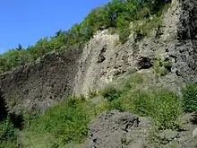 The large quarry, which is still visible, was established in the 20th century. The high, vertical faces of the outcrop were produced by a special, high risk, quarrying technique known as Hohlmachen (“cave making”). At the foot off the rock face a low cave was hewn out and filled with wood. After blowing up the wooden props, large areas of the rock face collapsed to the ground.