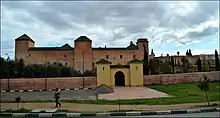 This was the main royal mosque of the kasbah, renovated or rebuilt by Moulay Isma'il, possibly around 1677, on the site of the former Marinid-era mosque of the kasbah.[6][16] It was accessed through two monumental doorways from Place Lalla Aouda or by another gate located near the qibla (southeastern) wall and accessed directly from the palaces.[6] From the gates on Place Lalla Aouda, the mosque was approached through a small courtyard or walled square (an unusual feature for a mosque), on the southeastern side of which was a madrasa and an ablutions house.[6][34] The mosque itself has its inner courtyard or sahn, surrounded an arched gallery and by the main interior prayer hall to the southeast. Another unusual feature was the two large chambers facing each other on the southwestern and northeastern sides of the courtyard, one of which served as a prayer hall for women and the other as a library.[6][20] The mosque's large green-tiled minaret, prominently visible from Place Lalla Aouda, is similar in form and decoration to that of the Grand Mosque of Meknes in the city.[6]