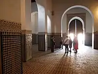 The main central courtyard of the funerary complex is sparsely decorated except for a central fountain and zellij pavement. The western and eastern sides of the courtyard are occupied by porticoes of three horseshoe arches. The eastern wall of the courtyard, in front of the mausoleum, also features a small mihrab (niche indicating the direction of prayer). Behind this are the mausoleum chamber and adjoining rooms. The northernmost of these rooms, which can be accessed directly from the northeastern corner of the courtyard, consists of an indoor patio or courtyard covered by a high cupola ceiling. The layout of this patio is similar to the Chamber of the Twelve Columns in the Saadian Tombs, consisting of a square delineated by twelve marble columns arranged in groups of three at each corner, around which runs a gallery space.[8] Another mihrab is set into the eastern wall, while a small side-chamber is set into the western wall. The upper walls and the areas around the mihrab and doorways are decorated with carved and painted stucco featuring arabesque and epigraphic motifs typical of Moroccan architecture. At the center of the patio is an ornate fountain, and while the cupola ceiling above primarily features painted and carved wood. The marble columns feature Moroccan-Andalusian capitals carved with leaf, palm, and palmette motifs.[38][8] These marble columns, as well as the ornately-carved marble panels in the archway leading to the mausoleum antechamber, are believed to be spolia taken by Moulay Isma'il from the former Saadian palaces of in the Kasbah of Marrakesh (such as the Badi Palace).[23]: 270