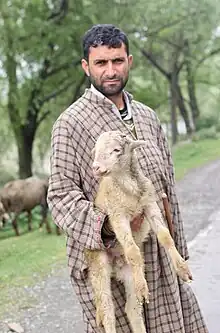 Kashmiris consume meat voraciously.[10][11] They share a love for lamb; the love a Kashmiri has for meat is unparalleled.[12][11] A good Kashmiri would not touch frozen meat, they feel it is not suited for the local cuisine.[13] They are, per capita, the highest mutton consumers in the subcontinent.[12] According to official data, around 2.2 million sheep are slaughtered in Kashmir every year on an average adding up to 21,000 tonnes annual meat consumption in the region.[14] Kashmiri Pandits are all Saraswat Brahmins, and hence avid meat-eaters.[15] The amount of mutton that is generally required to be bought for a Kashmiri Pandit wedding feast is 650 gm per head (not considering chicken).[16] Kashmiri Muslims prefer goat, especially young, while Kashmiri Pandits choose lamb.[17] Meat is called Neni by Pandits and Maaz by Muslims in Kashmir.[18] Asafoetida is mixed with yoghurt by Pandits and shallot mixed with garlic by Muslims.[5] In a majority of Kashmiri Pandit and Muslim cooking, bread is not part of the meal; it's always rice at lunch or dinner.[19] Bread is only eaten with tea in the morning or evening.[19] They may be bought from neighbourhood bakeries (qandurwan).[9]