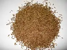 Rice is the staple food and has been so since ancient times.[6] The equivalent for the phrase "bread and butter" in Kashmiri is haakh-batta (greens and rice).[7] Meat along with rice, some vegetables and salad are prepared on special occasions like Eid.[8] Gravies are thin, very flavourful with no floating oil or masalas.[9] A typical everyday Kashmiri meal — lunch and dinner — consists of a generous serving of rice (about 250 gms), mutton (100 gms) and vegetables (about 100gms, mostly greens) cooked in oil, and yoghurt (50 to 250 gms).[7]