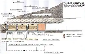 In the 1970s a building of 10 m (33 ft) width was found on top of the centre of the mound, and is thought to have been a grave marker. This, together with other evidence, supported the likelihood of a large funerary complex within. The tumulus was also found to have covered earlier cemeteries with at least 70 graves from the nearby "Hill 133" settlement predating Amphipolis.[4]