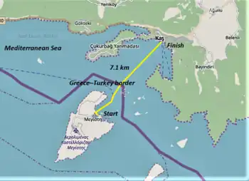 - 1 2 "Meis – Kaş, Greece-to-Turkey Cross-Border Swim". Open Water Swimming Association. 23 May 2019. Retrieved 10 August 2019.