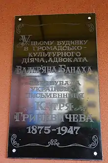 Katrya Hrynevycheva (Ukrainian:Катря Гриневичева) (November 19, 1875 – December 25, 1947) was a Ukrainian writer and community leader.