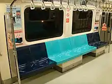 A mock-up was manufactured in Japan after Kawasaki won the contract.[23] It was shipped to Singapore and put on public display during the 1984 National Exhibition held in November 1984 at World Trade Centre.[23] The mock-up featured three choices of seating arrangements and colour schemes; members of the public were invited to give feedback on these options.[23] The finalised interior design of the C151 trains consisted of a fully longitudinal seating arrangement.[24] The bucket seats were made of plastic; glass partitions separated the seating areas from the passenger doors.[24] Strap lines for standing passengers were installed in the middle of every car.[24] The colour scheme of each adjacent car's interior is distinct to make car identification in cases of fault reporting easier for passengers.[24] Originally the colour scheme of the driving trailer cars was orange, that of the second and fifth motor cars was blue, and that of the two centre motor cars was green.[2] There were nine seats between two doors; this was reduced to seven after the first round of refurbishment.[24]