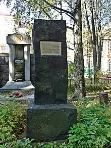 The site now occupied by the cemetery was formerly a garden which separated the Cathedral of the Holy Trinity from the Metropolitan's house.[1] The first burials took place in July 1917, the interments of Cossacks who had been killed while supporting the Russian Provisional Government during the dispersal of the Bolshevik demonstrators in the July Days. This gave the burial ground its name, Kazachye meaning Cossack.[2] Over the next few years further burials took place, with the cemetery being officially inaugurated in December 1919.[1] This became the fourth and final cemetery to be established in the monastery complex, after the Lazarevskoe in the 1710s, the Tikhvin in 1823, and the Nikolskoe in 1863.[3] Early members of the Communist Party were among those interred, including the secretary of Petrokommuna S. M. Scriabin, and writer A. M. Dmitrevskaya, together with soldiers who had fought to defend Petrograd from Nikolai Yudenich's White forces in 1919.[1] In 1921 some of those killed during the suppression of the Kronstadt rebellion were buried in a mass grave in the cemetery.[1]