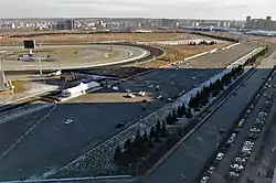 An old airfield for Kazan's major airport (situated outside city limits) was likely built during the World War II era. The airport was located eight kilometres (5.0 mi) northeast of the city centre, and has since been replaced by civilian construction, such as the residential development 'Kazan - 21st Century', Azure Skies (one of the tallest buildings in Kazan) and the largest international hippodrome in Russia. Although the airport is gone, the surrounding neighborhood still carries the name 'Old Airport' (tat. İske Aeroport, rus. Старый Аэропорт).
