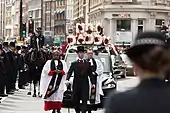 The following day, on 10 April, Palmer's coffin travelled in procession to Southwark Cathedral,[12] escorted by motorcycle outriders from the Special Escort Group of the Metropolitan Police. The route was 2.6 miles (4.2 km) long and avoided Westminster Bridge where the terrorist attack had begun.[13] Instead, the procession crossed the Thames over Lambeth Bridge, during which a ten-second horn salute was given by boats on the river.[12] Tens of thousands of people lined the streets, including 5,000 police officers.[12] The procession was fronted by a colour party carrying the Metropolitan Police Service Standard, who were followed by five mounted police officers.[13] Then came the funeral conductor and chaplains (including Rose Hudson-Wilkin, Chaplain to the Speaker of the House of Commons) who were walking in front of the hearse. The hearse carried Palmer's coffin which was draped in the police flag, and there were "red and white floral tributes atop the hearse"; these "spelled out 'No 1 Daddy', 'husband', 'son', 'brother', 'uncle' and 'Keith'".[13] Making up the rear were cars carrying his family, and four more mounted officers.[12]