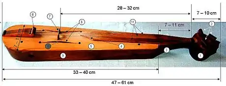 The Kemenche is distinguished by the uniqueness of its bottle-shaped form with a long neck and an oblong body. The pegbox is teardrop-shaped and is called "kifal" (Head) in the Pontic dialect. It is the upper part of the instrument. In the "kifal", the tuning keys are wedged, the "otia" (ears), which are T-shaped (usually) and the strings are tied to them, which, after crossing the whole instrument, end up in the tailpiece ("palikar"), a wooden component in the shape of an elongated inverted triangle, located at the bottom, on which the lower ends of the strings are attached. The three strings are attached to the bridge ("donkey"), a component that carries three incisions - notches to keep the strings stable. Inside the lyre, a piece of wood, the soundpost, is wedged. The sides of the instrument are flat and are called "magla" (cheeks). The neck ("goula") is the point at which the lyre player holds the instrument. The sound comes from two curved or straight soundholes, the "rothonia" (nostrils), and through holes in their ends, on the lid and on the side. A typical lyre has: two holes on each side, four holes in the soundboard (two at the top and two at the bottom) and one at each end of the soundholes.[10]