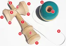 The kendama (けん玉, "sword [and] ball") is a traditional Japanese skill toy. It consists of a handle (ken), a pair of cups (sarado), and a ball (tama) that are all connected together by a string. On one end of the ken is a cup, while the other end of ken is narrowed down, forming a spike (kensaki) that fits into the hole (ana) of the tama. The kendama is the Japanese version of the classic cup-and-ball game,[1] and is also a variant of the French cup-and-ball game bilboquet. Kendama can be held in different grips, and many tricks and combinations can be performed. The game is played by tossing the ball into the air and attempting to catch it on the stick point.[2]