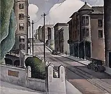 Nomura worked as a sign painter in the camp, which allowed him access to paint and brushes. Painting or sketching on whatever materials were available, he created a moving visual record of life in detention. Very few of his internment camp paintings utilized the blended, dark colors which gave a heavy tone to much of his previous work. Some of the works are as small as 5" by 8". One is rendered in crayon on construction paper. Although straightforward and representational, the subjects he chose give a greater insight to what internment was like. The Main Gate, with the Puyallup Fair's main gate building in the background, shows the fenced-off area and shed where visitors from the outside world could meet with the camp's residents. A military policeman, gun at his side, can be seen leaning against the visiting area's back fence. Guard Tower, painted during the winter of 1942-'43, shows a dark and ominous winter sky and a plane of snowy ground broken by a line of barbed wire fence. The Laundry and Sanitation Building, one of the few paintings to feature any people, shows a lone woman with a basket walking to the laundry building in a scene heavy with dull browns and greens.[13]