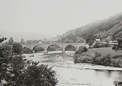 Preparatory earthworks and riverworks for building the bridge began in 1825 and on 16 August 1826 the first stone of the bridge abutment foundations was laid.[28] Richard Burton soon withdrew from the project. BD (David) Jones of the Tredegar Ironworks, then in Monmouthshire, now in Blaenau Gwent, took over in 1826,[25] with his engineer William Armstrong,[29] and completed the building.