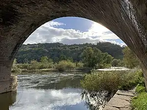 It was the only bridge built over the River Wye to accommodate barge traffic,[34] and to aid this traffic Jones built a stone-slab towpath, 5 feet (1.5 metres) wide, through the arch nearest the right bank. At the upstream end of the towpath the remains of a small barge wharf can be seen, though it is uncertain if this was built at the same time.