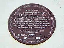 The footbridge to the south of the station is also noteworthy and is Grade II-listed in its own right.[10][11] The railway line bisected Kew, but it was not until 1912[10] that the bridge was provided to allow residents to cross the tracks safely (previously, a level crossing was used, with the added disadvantage of delaying trains). It is a rare surviving example of a reinforced concrete structure built using a pioneering technique devised by the French engineer François Hennebique.[17] The bridge has a narrow deck and very high walls, originally designed to protect its users' clothing from the smoke of steam trains passing underneath. It also has protrusions on either side of the deck to deflect smoke away from the bridge structure.[18] It was restored in 2004[19] with a grant from the Heritage Lottery Fund, in a project led by The Kew Society.[18] In July 2017, concerns were expressed about the structural safety of the bridge.[20]