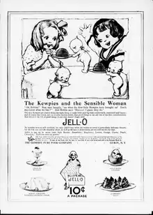 The small dolls became an international hit, and by 1914, O'Neill had become the highest-paid female illustrator in the country,[4] garnering a small fortune from the wild popularity of the dolls.[8] The Kewpie brand soon became a household name, and was used widely in product advertising, including promotion for Jell-O, Colgate, Kellogg's Corn Flakes, and Sears.[2] The Kewpies also appeared as a brand on a multitude of household items and other memorabilia, such as dishware, rattles, soap, pepper shakers, coloring books, poetry collections, and stationery.[9]