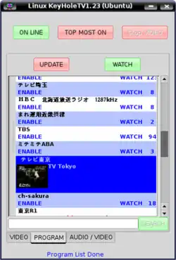 KeyHoleTV is an online television portal that links to Japanese television channels, radio stations, and user-made channels. KeyHoleTV only has a narrow selection of channels, such as TV Asahi, NHK General TV, NHK Educational TV, Fuji TV, TBS, TV Tokyo, Tokyo MX and Nippon TV. Most are analog and some of the applied channels are password protected. However, it does have the US Military's AM radio station in Japan AFN Tokyo Eagle 810.
