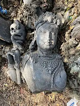 Robert Beer relates how the symbolism of the khatvāṅga in Vajrayana Buddhism, particularly the Nyingma school founded by Padmasambhava, was a direct borrowing from the Shaiva Kapalikas, who frequented places of austerity such as charnel grounds and crossroads as a form of "left-handed path" (vamachara) sādhanā.[4] In the Buddhist lore, it is also a particular divine attribute of Padmasambhava and endemic to his iconographic representation and depicted as an accoutrement of his divine consorts, Mandarava and Yeshe Tsogyal. In the twilight language, it represents Yab-Yum. The weapon's three severed heads denotes moksha from the three worlds (Trailokya); it has a rainbow sash representing the Five Pure Lights of the mahābhūta.