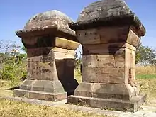 'Twin Stupas. The Twin Stupas are two red sandstone structures, 1.93 m. square and 4.20 m. high, with lotus-bud-shaped apices.