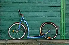 A kickbike (bikeboard, footbike, pedicycle) is a type of kick scooter (also referred to as a push-scooter or scooter) and is a human-powered street vehicle with a handlebar, deck, and wheels propelled by a rider pushing off the ground.[1] The kickbike often has a large standard size bicycle front wheel and a much smaller rear wheel, which allows for a much faster ride.