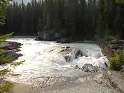 The river has three waterfalls along its stretch. The first is the Kicking Horse Cascade, a long talus cascade which occurs just below the first highway crossing of the river below Wapta Lake. The second is the Natural Bridge Falls near Field. The final and largest is 100-foot (30 m) Wapta Falls, one of the largest waterfalls in Canada in both volume and width. They are over 500 feet (150 m) wide.