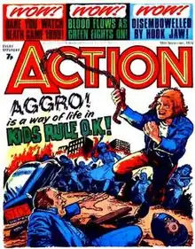 - ↑ Chris Lowder (w), Mike White (a). "Kids Rule O.K." Action (11 September to 16 October 1976). IPC Magazines.