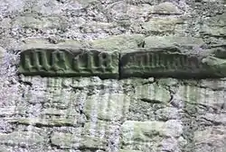 This wing was constructed in 1627 at right angles to the old keep using rubble faced with dressed with sandstone ashlar.[22] A door was broken through from the hall of the old keep to a staircase in the mansion house. The mansion was a fine specimen of 17th-century architecture.[18] It had turrets corbelled out at hall level and these contained closets. The front door was set in an unusual shallow projection and a narrow back door at the north facing aspect led into a courtyard. Two cellars existed with a passage between them that connected with the main staircase.[17] The hall in the old tower may have been used as a dining area and the large room in the mansion house utilised as a drawing-room.[18] The most southerly turret and a large part of mansion house wing fell at some point between 1956 and 1964.[23]