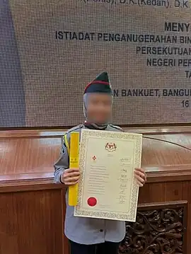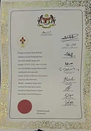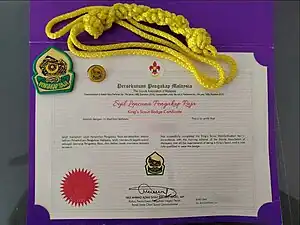 The King's Scout Certificate or also known as the King's Scout Royal Certificate is issued by Scouts Association of Malaysia headquarters is given by the state Sultan or Governor in the name of the Yang di-Pertuan Agong Malaysia, the Patron of the Scouts Association of Malaysia. This certificate is unique because it has 10 signatures, preceded by incumbent Yang di-Pertuan Agong Malaysia and the 9 Sultans of the royal states.[14] So far, no other certificate can match or beat the King's Scout Certificate.