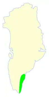 King Frederick VI Coast (Danish: Kong Frederik VI Kyst)[1] is a major geographic division of Greenland. It comprises the coastal area of Southeastern Greenland in Sermersooq and Kujalleq municipalities fronting the Irminger Sea of the North Atlantic Ocean.[2] It is bordered by King Christian IX Land on the north and the Greenland Ice Sheet to the west.